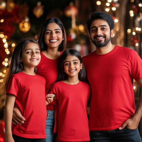 indian family of 4 people ,father,mother and 2 children wearing red half sleeve plain tshirt in xmas ambiance with editable front tshirt print area