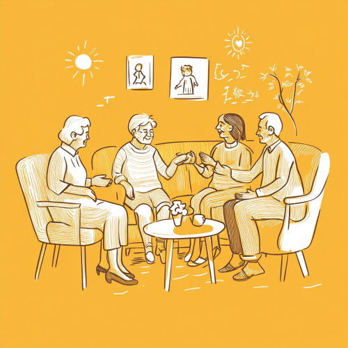 line art of the family with elderly parents on sofa set enjoying and talking each other. line color mustard and the wrold Family is written on the back wall.