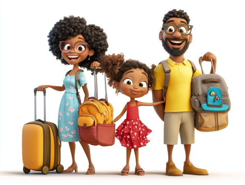 a cute avatar of a black family of four, packed to go on an awesome vacation. everyone is excited, except the teenage girl can't be bothered. solid white background. style of pixar 3D. --ar 4:3