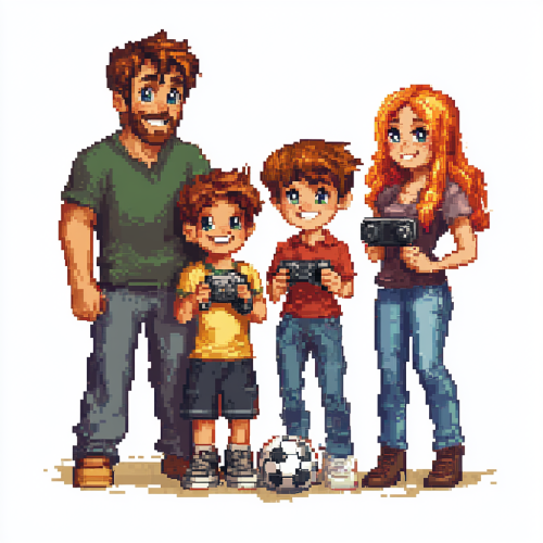 Create a pixel art scene featuring a family of four as the main focus. Highlight the two twin boys, one holding a soccer ball and the other holding a computer controller, both dressed cool. Include their dad with brown hair and their slim mom with red hair, smiling beside them. Ensure all four characters are prominently displayed together in the scene. The background should be solid white to emphasize the characters. Use bright colors to create a lively and cheerful atmosphere, capturing a fun family moment.