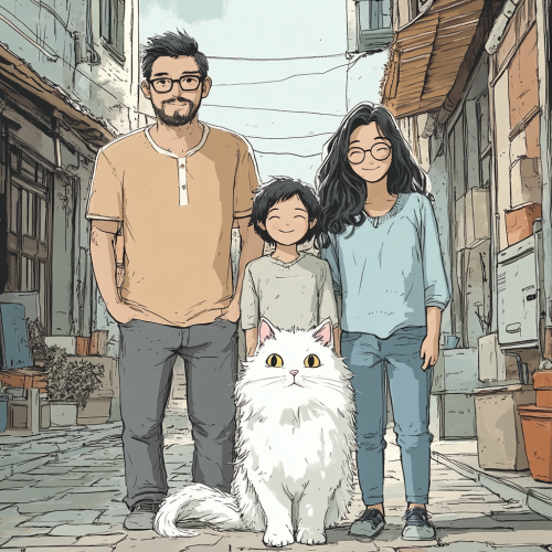 Create a comic showing a family of four in China: a young glasses-wearing father and a glasses-wearing long-haired mother standing in the back, with a 10-year-old son and a 7-year-old daughter standing in front. In the middle, there is a white long-haired cat.