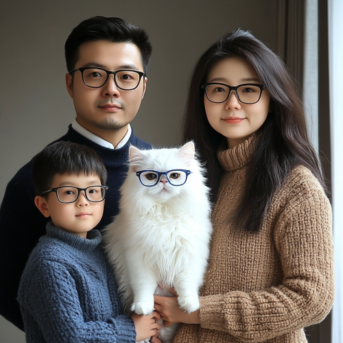 A family of four in China includes a young father and mother, a 10-year-old brother, and a 7-year-old sister. The father wears black-framed glasses, and the mother has long hair and also wears glasses. They also have an adorable white cat with long fur and blue glasses. In the family photo, the four people and the cat are all present: the father, mother, brother, sister, and the cat. The cat is standing between the two children, while the father and mother stand behind them.