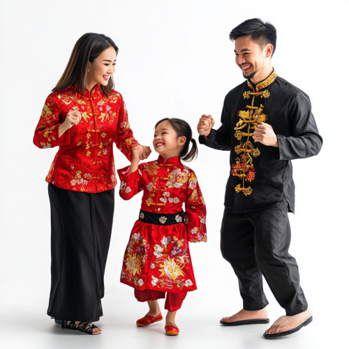 A Chinese Filipino family of four, wearing modern and stylish clothes, celebrating Chinese New Year, dancing, happy, smiling, full length, isolated white background