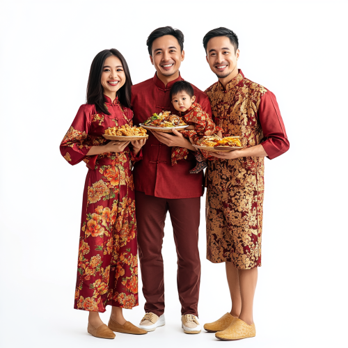 A Chinese Filipino family of four wearing modern and stylish clothes, celebrating Chinese New Year, happy, smiling, holding Chinese food, full length, isolated white background