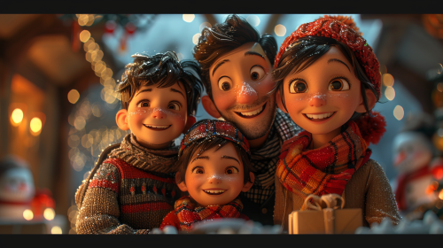 Create a heartwarming scene in a Disney 3D animation style, featuring a joyful family of four--father, mother, son, and daughter--celebrating together indoors. The family should be facing the viewer, as if posing for a photograph, with bright, cheerful expressions that convey happiness and togetherness. The overall composition should be simple and clean, emphasizing the warmth of family bonding while capturing the festive spirit of the holiday --ar 16:9 --v 6.0 --s 750