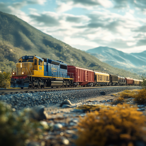 Hyper-realistic. Realistic photo of a modern locomotive with wagons carrying cargo, traveling through a Latin American landscape, seen from the side, with yellow, blue and red colors. 50mm F/1.8