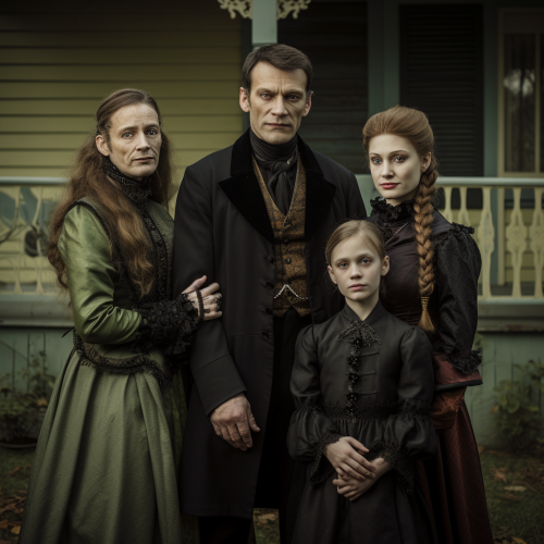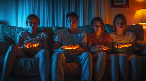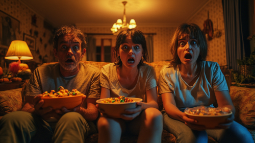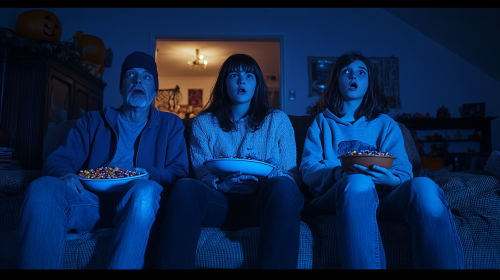 Movie still, documentary photography, editorial, in the style of Martin Parr off-centered shot of father, a mother, and two teenagers--sitting together on a comfortable sofa in their living room, watching a horror movie on a television. The room is dimly lit, with Halloween decorations. They are holding bowls of candy in their hands, and their expressions show a mix of fear and laughter at what they see on the screen. Capturing the Halloween spirit. Cinematic light, 35mm, intricate details --ar 16:9