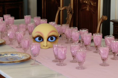 table filled with bowls filled with eyeballs ::2, creepy castle in candy land, in the style of horror film, in the style of high speed film, girly pastel film, Lisa frank, lavender pink and silver, vhs, purple and white, carrie graber, movie still, close up --ar 3:2 --weird 200
