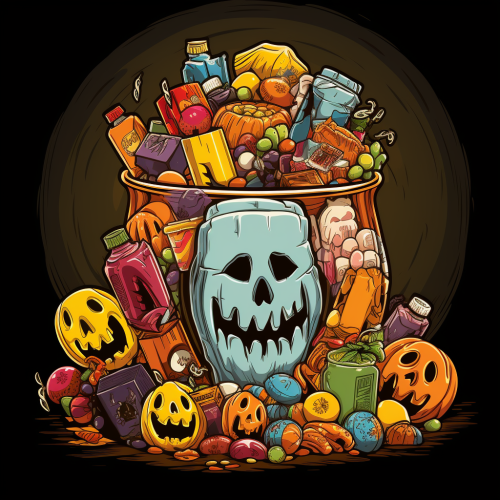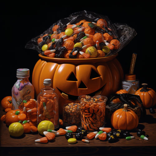 imagine Create a cartoon-style night scene inspired by DreamWorks or Pixar featuring four youthful characters dressed as Frankenstein, Dracula, a mummy, and a feminine character as Morticia. The characters are in playful poses or dancing, all centered in the composition. The camera angle is general. The environment is set on a street in a world made of candy and cookies, with a stylized castle visible in the distance --ar 3:1 --s 50