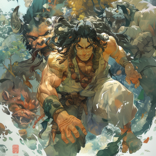 Japanese anime illustration / highly stylized fantasy world / full body rugged man / confident self-deprecating facial expression / epic masculine body pose / bold composition / eye-catching / vibrant colors / visually stunning / background depicts ferocious fantastical creatures / comical / fantastical / powerful / thought-provoking / whimsical --v 6.0