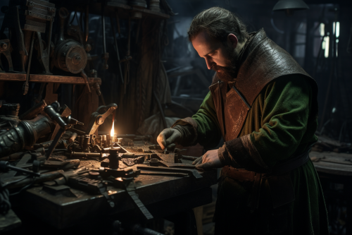 a scene of a batfolk working as a blacksmith, it wears 16th century italian renaissance clothes, the colors that stand out the most are green and purple, the design is steampunk and fantastic, darkness hidden darkness, lots of details, ultra realistic --ar 3:2