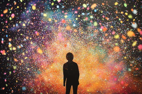 impressionist illustration of a human figure bursting into a firework of brightly colored, glittery confetti. It fills the atmosphere with flecks of every conceivable color. --style raw --ar 3:2