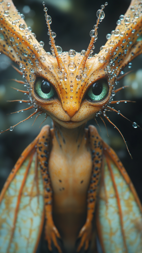 By Brian froud, a leopard pattern, thorny fantasy alien elf with numerous crystal droplets on its wings, captured through macro photography against a dark background. A fantastic photograph of an alien elf with long intricate spines and large wings covered in dewdrops, in high resolution and with detailed, intricate features. The image is characterized by natural lighting, professional colour grading, soft shadows, and a clean, sharp focus, resulting in a masterpiece of a photograph. --ar 9:16 --stylize 750 --v 6.1