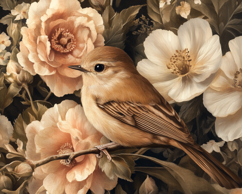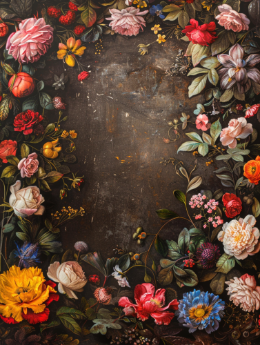 in the center of the sheet there is free space for A4 text surrounded by blooming flowers and plants , in an old vintage, in the style of Thomas Ascott. A highly detailed, ultra realistic masterpiece painting. --ar 3:4 --v 6.0