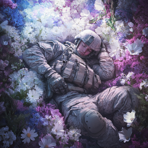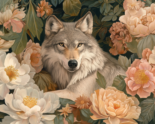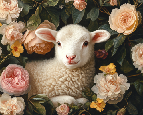 This image features an adorable little lamb nestled among a lush assortment of large, blooming flowers. The lamb, with its soft, fluffy white wool and small, gentle face, is the focal point of the scene. Its bright, innocent eyes and small, pink nose give it a sweet and endearing expression, adding charm and warmth to the composition. The background remains unchanged, with richly detailed flowers surrounding the lamb. The flowers, with large, delicate petals in soft pastel shades of peach, cream, and pink, add depth and natural beauty to the image. Lush green leaves and slender branches complement the flowers, creating a vibrant, harmonious setting. Smaller buds and blossoms add further texture and liveliness to the arrangement. The combination of the cute little lamb and the blooming flowers creates a peaceful, nature-inspired scene. The soft color palette and intricate floral details evoke a sense of warmth and tranquility, making this image perfect for a delightful and relaxing v 4 --ar 5:4
