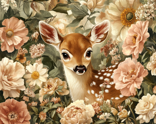 This image features a little, cute deer nestled among a lush assortment of large, blooming flowers. The deer, with its soft brown fur and white spots, sits gently at the center of the scene. Its big, bright eyes and small, delicate nose give it an innocent and endearing expression, adding a sense of sweetness and warmth to the composition. The background remains the same, with richly detailed flowers surrounding the deer. The flowers, with large, soft petals in pastel shades of peach, cream, and pink, add depth and natural beauty to the image. Lush green leaves and slender branches enhance the vibrant, harmonious setting, while smaller buds and blossoms bring extra texture and liveliness to the arrangement. The combination of the adorable little deer and the blooming flowers creates a peaceful, nature-inspired scene. The soft color palette and intricate floral details evoke feelings of warmth and tranquility, making this image perfect for a delightful and calming v 4 --ar 5:4