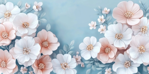 Create a design with pastel-colored flowers in a muted gradient of purple and pink. Include some gold accents and give the design a spiritual, sparkling feel. The design should have a watercolor-style look, with flowers blooming around all four edges and a white space left in the center.