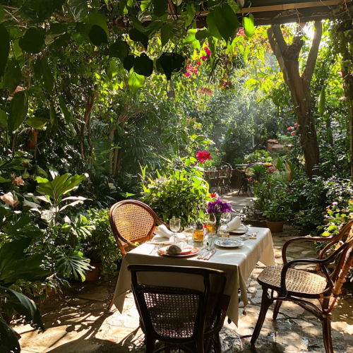 A cozy outdoor lunch setting amidst blooming flowers and lush plants, sunlight dappling through the leaves, creating a tranquil and refreshing atmosphere.Taken with an iphone 15