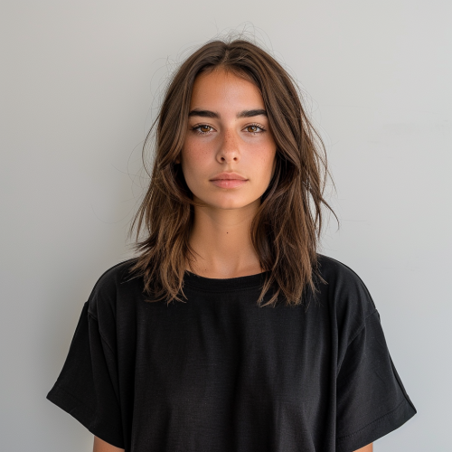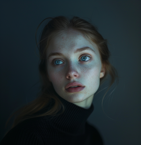 a 25 year old girl has blue eyes and wears a , in the style of bjarke ingels, dark, muted colors, portraits with soft lighting, hiroshi sugimoto, andrzej sykut, serene faces, photo --ar 107:110