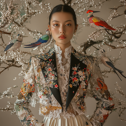 a full body frame photo of a female model wearing a blazer ,feminine Taylor cut in lace fabric over silk embroidered with small colorful birds and pearls in japonese art style and a trousers in delicated thin pleated cetim,8k resolution,high detailed photo