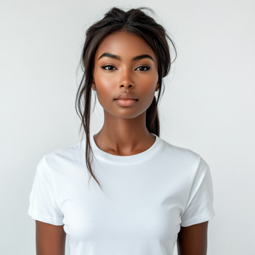 White t-shirt mockup, superb female model wearing a white bella canvas 3001 crewneck t-shirt , facing forward in a fashion photoshoot pose, professional photo, photo realistic with detailed skin texture and detailed fabric, natural lighting, minimalist white background