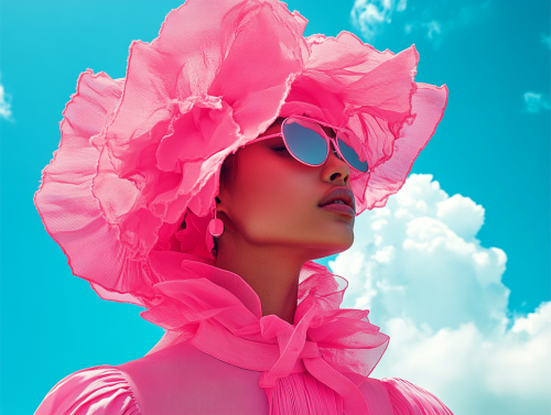 A female model in a pink posing, fashion outfit design by Maria Grazia Chiuri, metropolis meets nature, blue sky and white clouds, minimalism, spectacular backdrops, bold color schemes, organic sculpting, in the style of surrealist-inspired, androgynous, contemporary candy-coated --ar 4:3 --stylize 550