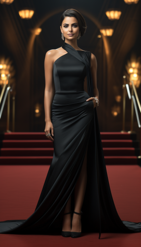 a full body shot of a beautiful and sophisticated arabic female fashion model she is posing for a fashion shoot set on the red carpet of a movie premiere. She is in her mid thirties, she has very very short black hair in a buzzcut, she is wearing an evening gown and high heels. 4k photo realistic cinematic --v 5.2 --ar 4:7 --s 250