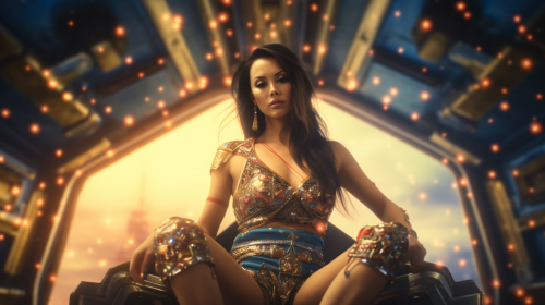 hyper photo realistic, Asian female, full body, gorgeous, workout, shiny yoga pants, flirting at the helm of a spaceship, with stars whizzing by in the background, very colourful and pirate like --chaos 10 --ar 16:9 --v 5.2