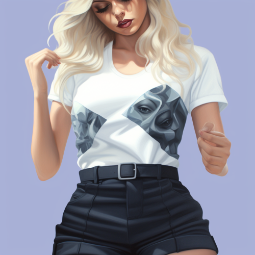 a blond female posing in high waisted shorts, in the style of tanya shatseva, white and black, michael page, beautiful women, quadratura, trish mistric, light white and dark gray