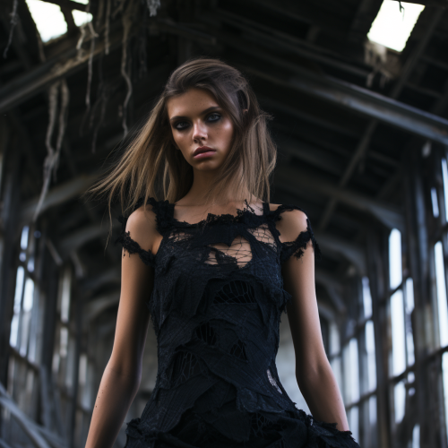 fashion photography, female model, abandoned building, edgy shoot, horror