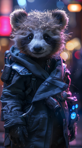 High Tech & Cyberpunk: "A panda gaining attention in a digital fashion show, wearing high-tech accessories and futuristic outfits reflecting a cyberpunk universe --ar 9:16 --s 750 --v 6.0