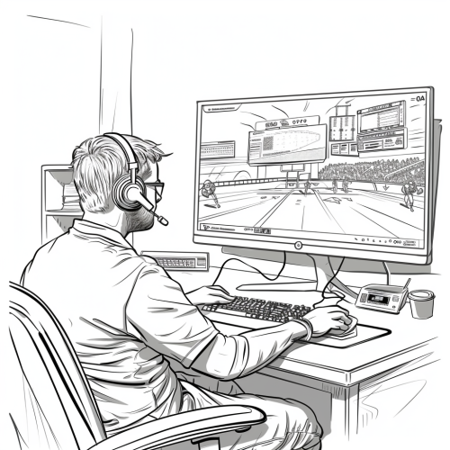 line drawing on a background of #007bff, of a non professional sports gambler using a computer for sports stats, with a tv in the background with a football game that he can watch --v 6.0