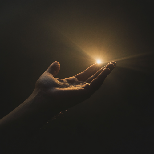 Create a realistic image of a hand reaching out toward a small, bright light in the center of the frame. The background is dark and shadowy, with the light radiating soft beams in all directions, creating a glowing halo effect around the hand. The hand is partially illuminated by the light, with subtle shadows adding depth and dimension. The overall mood should feel mysterious, warm, and slightly ethereal, as if the person is reaching for something hopeful or otherworldly