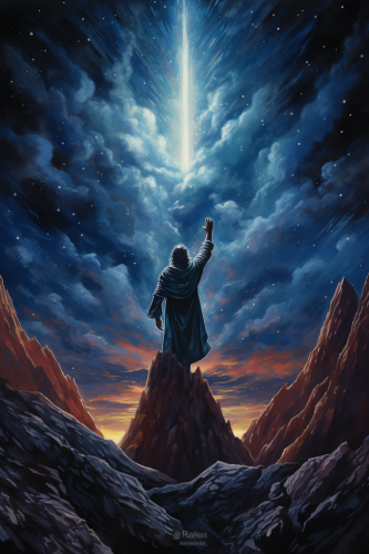 painting of a colossal god looking down on the mountains of earth, reaching down with enormous hand, starry sky --ar 2:3