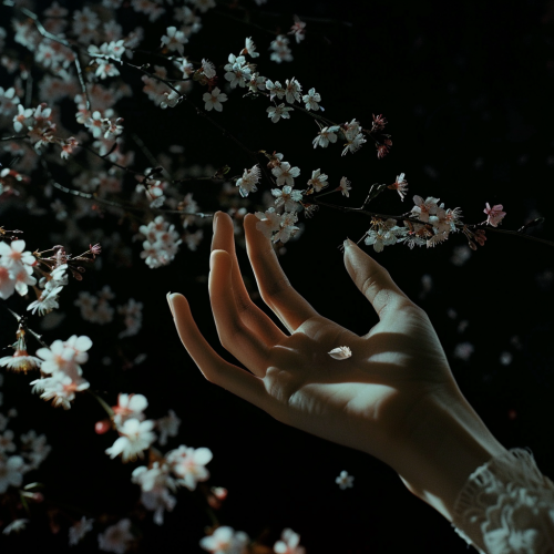 female right hand in a pinching position reaching into frame with cherry blossoms dancing around the hand lit by overhead softbox out of frame, the hand is solo in frame reaching in from the right side with black background --v 6.0 --ar 1:1