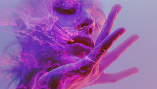high resolution photo of a hand connecting the real physical world into the virtual, digital world, doing research in the digital world, digital elements, breaking the barriers between the virtual and real world, faces are visible, purple and pink tones --ar 7:4