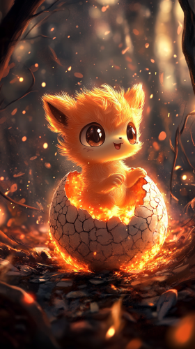 A chibi-style baby Chimchar, with its adorable, fluffy orange fur and big, expressive eyes, emerging from a cracked, cozy egg. The scene is surrounded by a gentle, warm glow with playful, tiny flames and sparkling embers dancing around. The background features a whimsical, fiery landscape with soft, swirling fire effects and a charming, friendly atmosphere. Baby Chimchar’s emergence is highlighted by radiant, cute bursts of flame and a heartwarming, fiery ambiance, all in 8K, HDR, high quality, ultra-realistic details --ar 9:16