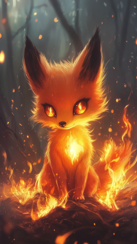 Chibi renard avec des pouvoirs de feu, ses yeux brillent comme des flammes, et sa queue dégage des petites étincelles incandescentes. Son pelage est d'un rouge ardent avec des touches de jaune orangé, comme s'il était enflammé. Le fond montre une ambiance de feu avec des braises flottantes autour de lui. 8K, highly detailed, --ar 9:16