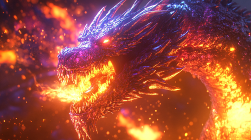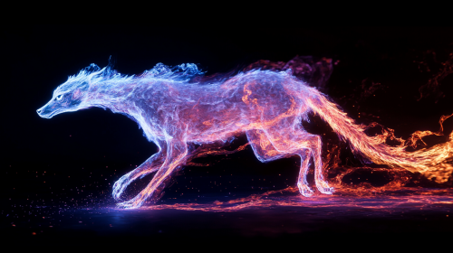 A full body shot of an ethereal white color Anvilwrought Raptor composed entirely of flowing fire, each part of its body formed by flickering flames that dance and swirl as it walks slowly toward the camera. Its form shifts with vibrant, intense shades of blue & violet, red, and hints of blue at the hottest points, creating a mesmerizing, liquid-like effect. Trails of embers and sparks flow off its fiery body, and the background is pitch black, making the fire's glow the focal point. Shot with a Sony A7S III, 85mm lens, high contrast with dynamic, fluid VFX emphasizing the fire's movement --ar 16:9 --v 6.1
