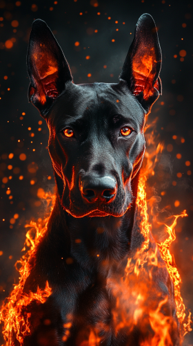 Chien Doberman avec des pouvoirs de feu, son pelage est noir avec des reflets rouges et dorés, créant un effet de braises ardentes. Ses yeux scintillent d’une lueur de feu, et des éclats de flammes se forment autour de ses pattes et de sa queue. Le fond montre un paysage en feu avec des flammes s’élevant dans l’air et des cendres flottantes. 8K, highly detailed, --ar 9:16