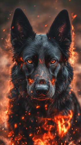 Chien Berger Allemand avec des pouvoirs de feu, son pelage est d'un noir profond avec des éclats de rouge et d'orange, comme des flammes. Ses yeux brillent d’une lueur ardente, et des flammes dansent autour de ses pattes et de sa queue. Le fond montre une scène de feu, avec des flammes et des braises illuminant le paysage. 8K, highly detailed, --ar 9:16