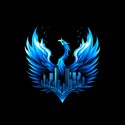 Design a striking logo featuring the Houston skyline with a blue, fiery phoenix soaring upward, symbolizing renewal and resilience. The phoenix should be surrounded by bright blue flames, creating a strong contrast against a black background. The design should evoke power and energy, with the phoenix's wings and flames extending upwards, creating a sense of movement and dynamic transformation.