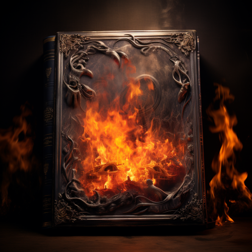 Fiery Flames Surround Old Silver-Embossed Black Book