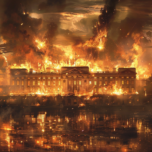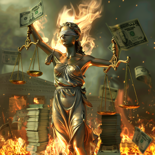 Blind Justice statue in flames being burnt by large stacks of money
