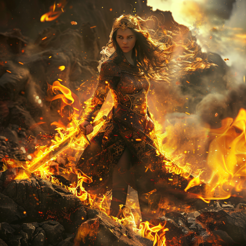 A fire goddess, soaring through the sky dressed like a phoenix, spreading her wings across destructive volcanos and setting the sky on fire.
