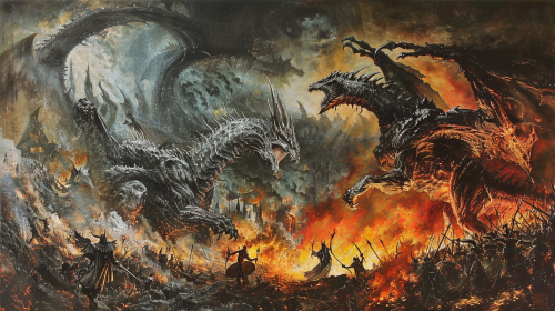 Silmarillion Gothmog fighting Ancalagon the Black in Angband --v 6.0 --ar 16:9