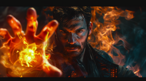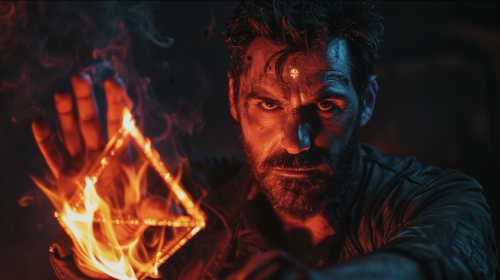 In cinematic style, a 38 year old man with dark hair and a scruffy short beard. he wears black clothing that have accents of neon orange and red. on his hand is a triangle shaped ring that is the color smoky. he is holding up his hand as a ball of flames is coming out of his palm. --ar 16:9