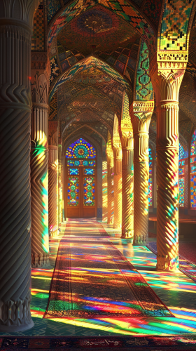 hyper realistic of A hallway inside a historical Iranian mosque, colorful stained-glass windows casting light onto polished turquoise and sapphire tiles, tall intricately carved columns, golden light of sunset streaming through, Persian architectural beauty, serene and majestic atmosphere, hd quality --ar 9:16 --v 6.0