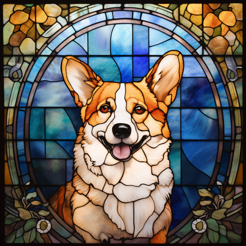Corgi, in a light better than ever shone edward burne-jones style, stained glass style