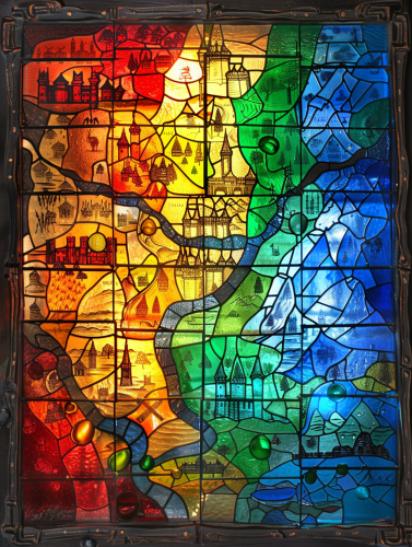 A stained-glass map of an ancient kingdom, with intricate pieces of colored glass depicting rivers, mountains, and castles. The map glows as sunlight streams through, casting vibrant colors and shadows on the surface below. Rich tones, radiant lighting, strong shadows. Created Using: stained-glass art, medieval design, hand-cut glass, leaded lines, vibrant color palette, illuminated textures, historic motifs, artistic craftsmanship, hd quality, natural look --ar 3:4 --v 6.0